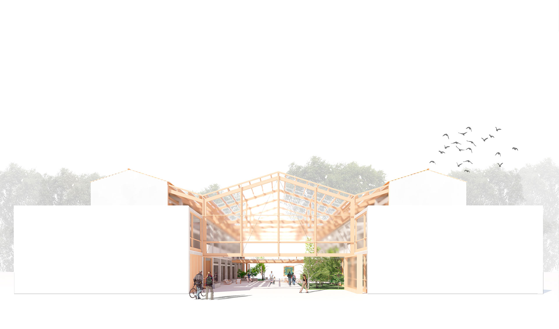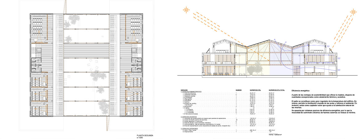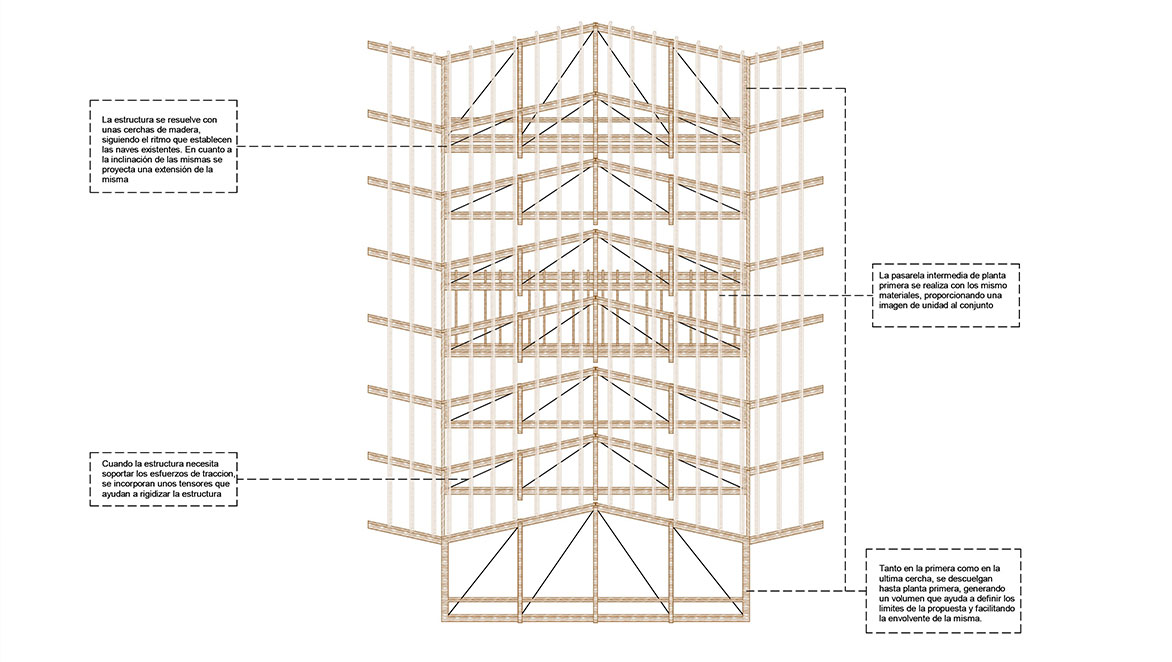 El proyecto se materializa como el diálogo de las dos naves existentes, un nexo de unión que convierte dos edificios aislados en uno mismo, esta unión posee un carácter permeable según la época del año. La solución adoptada se formaliza desde la austeridad formal y constructiva, adaptándose a la existente. El proyecto tiene un papel primordial a la hora de su integración en el conjunto, desde mantener viva la imagen del conjunto, adaptarse a las inclinaciones existentes. Al incorporar vegetación autóctona enfatiza su integración. Gracias a la estrategia seguida en el proyecto, refuerza la identidad propia del lugar. El proyecto se centra en volcar la vida hacia el claustro generado, núcleo vertebrador de la propuesta.