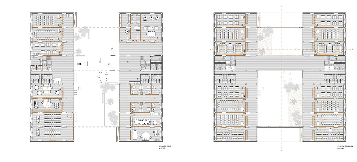 Esta premisa origen, unida a la racionalidad de los edificios existentes, lleva a tomar la decisión de conservar la estructura , y gran parte de los elementos constructivos que configuran las fachadas, realizando pequeñas intervenciones de mejora, eliminar la totalidad de las fachadas que se abren al nexo de unión entre los dos volúmenes con el fin de dotar de una funcionalidad adaptada a las necesidades del programa del nuevo edificio.