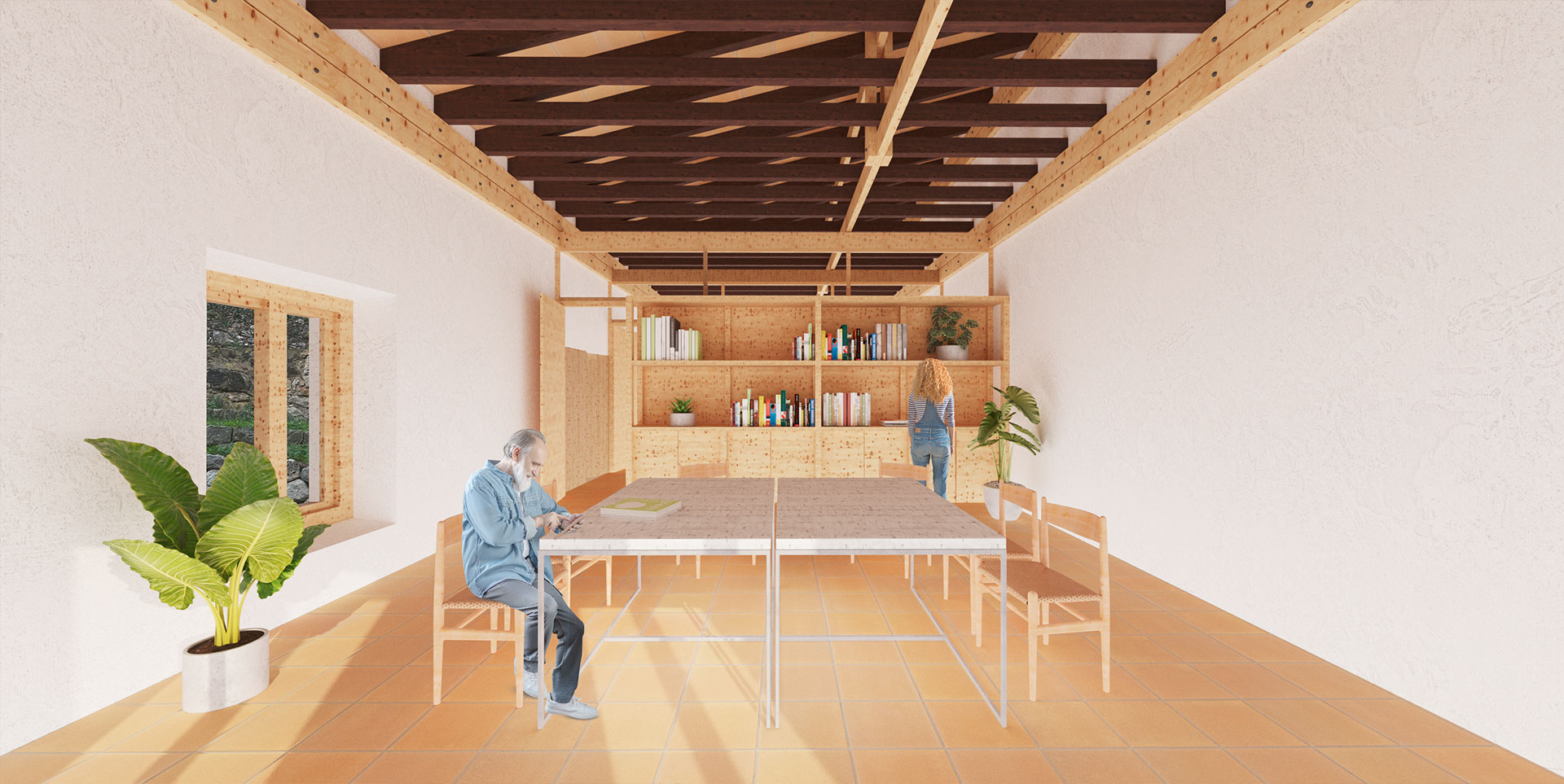 On the roof, the original form of Arabic tile covering has been respected. The intervention preserves the form and textures of the existing construction elements, thus maintaining the possibility of a reading of each moment in the history of the house. The purpose of the intervention is to recover the supporting and special structure of the house. The additions that altered the spatial configuration of the building are removed and the levels are recovered. The project is materialized with a single wooden element, a 210x70 mm section pine plank.