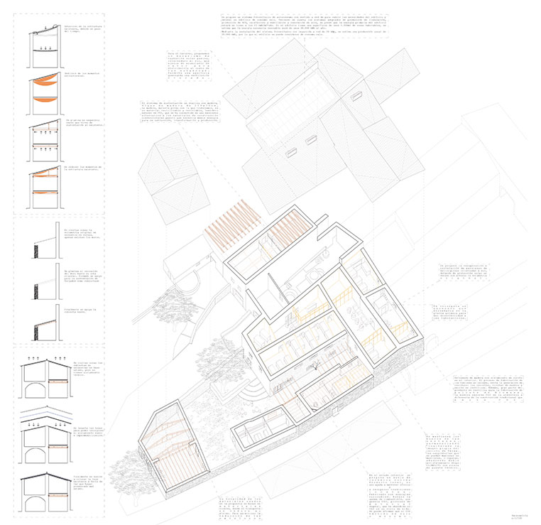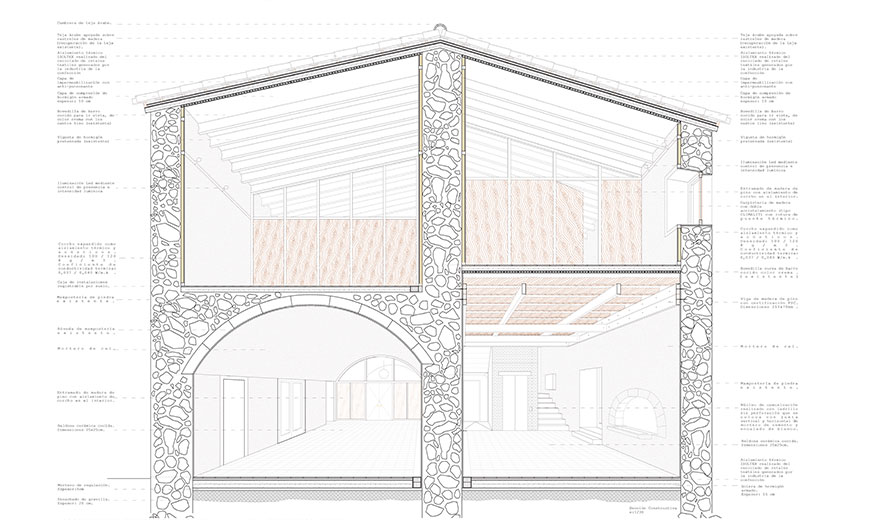 The guidelines that guide the recovery of the building, are raised from a criterion of constructive rationality, and a natural, credible and unbiased attitude. Stability is ensured and the support of the house is resolved with an exoskeleton, a kind of permanent and reversible felling with the techniques and construction language of the 21st century that provides support to the existing, without dismantling anything, safeguarding all the pieces constructive elements of the house, and adds another layer of our time to the house. The structure offers an open construction process without prejudice, so the final shape of the skeleton is the result of the rationality of the construction process.
